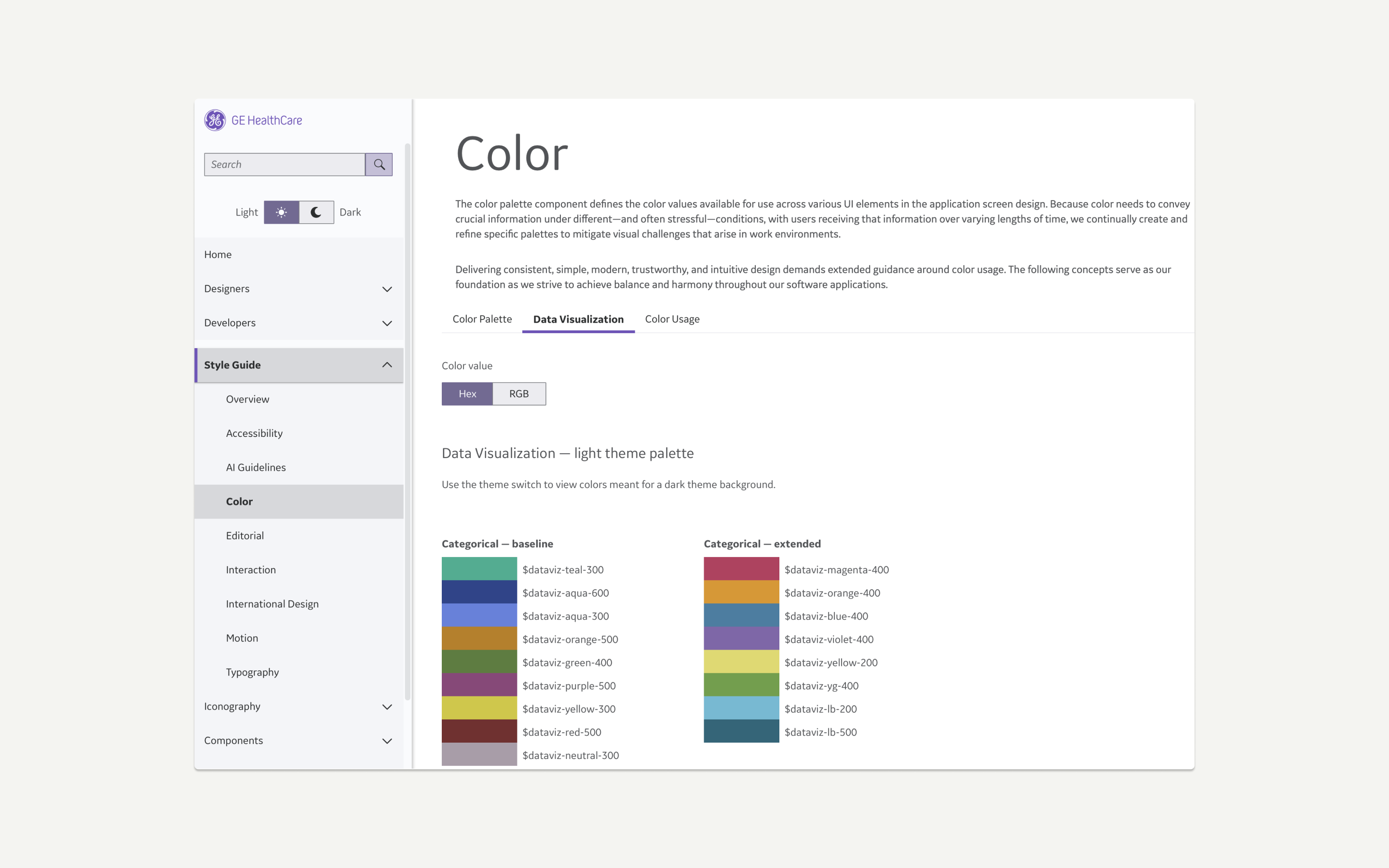 The color palette component defines the color values available for use across various UI elements in the application screen design. Because color needs to convey crucial information under different—and often stressful—conditions, with users receiving that information over varying lengths of time, we continually create and refine specific palettes to mitigate visual challenges that arise in work environments.