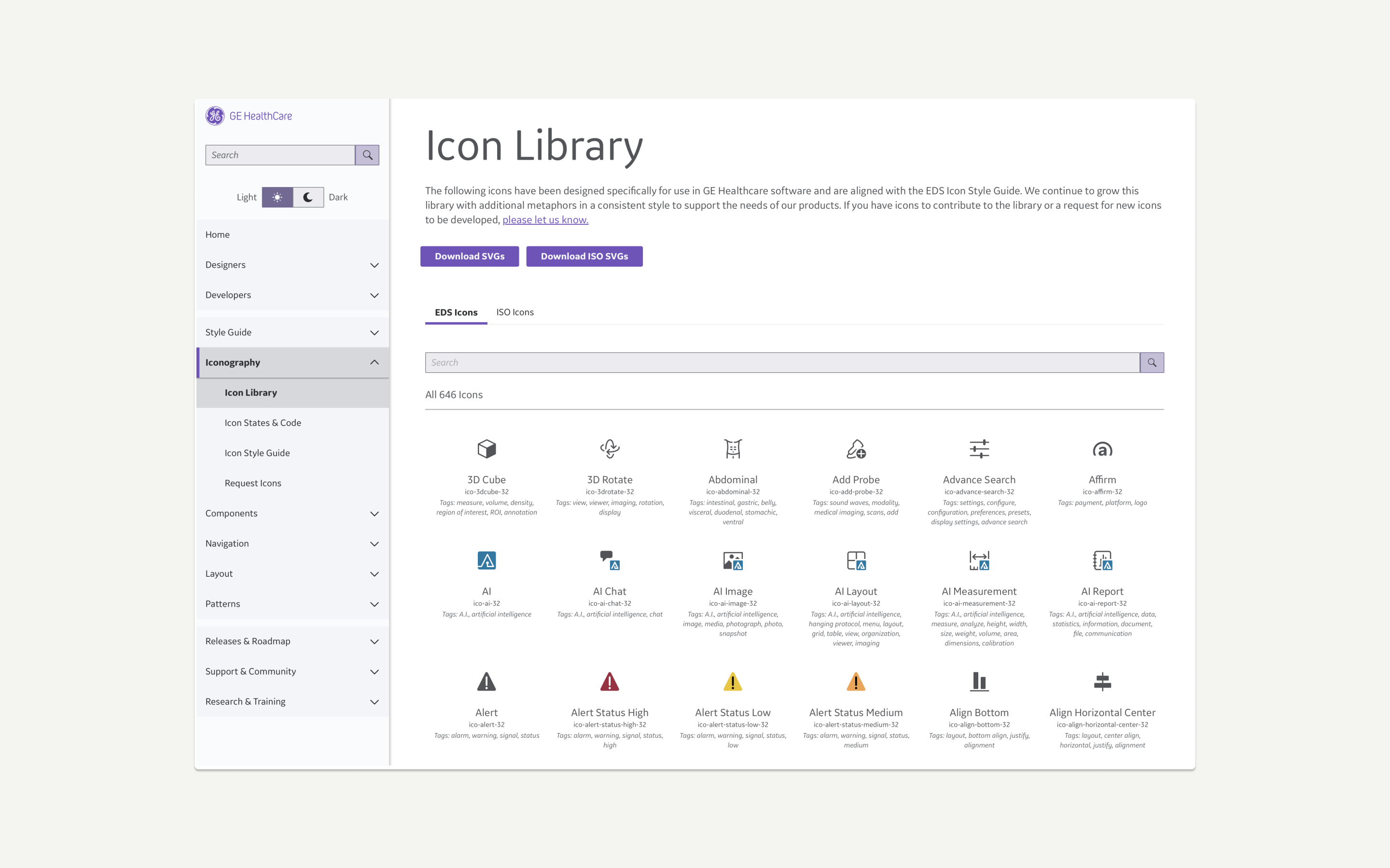 Icons are visual symbols leading to an action or representing a function on a user interface (UI). GE HealthCare has an extensive set of icons for use across applications and websites, ranging from simple metaphors to niche medical terminology.