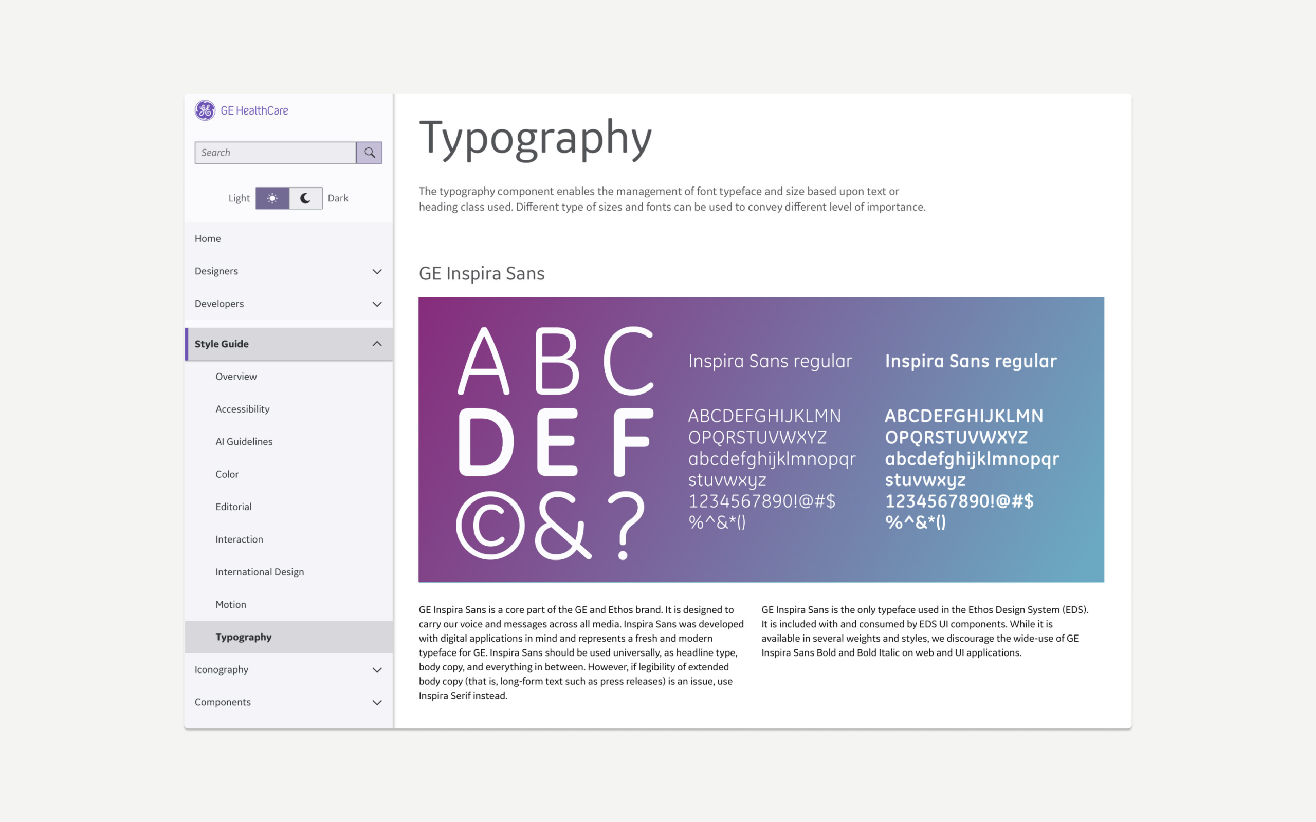 Typography plays a fundamental role in maintaining a cohesive user interface (UI) design. The Edison Design System (EDS) uses a single typeface, GE Inspira, across all GE HealthCare applications and websites. This contemporary and versatile font is integral to GE HealthCare branding and is integrated into EDS components.