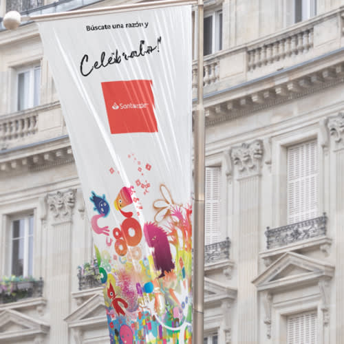 Large displays like city bus stops featured the key animation, accompanied by simple, bold celebratory statements.